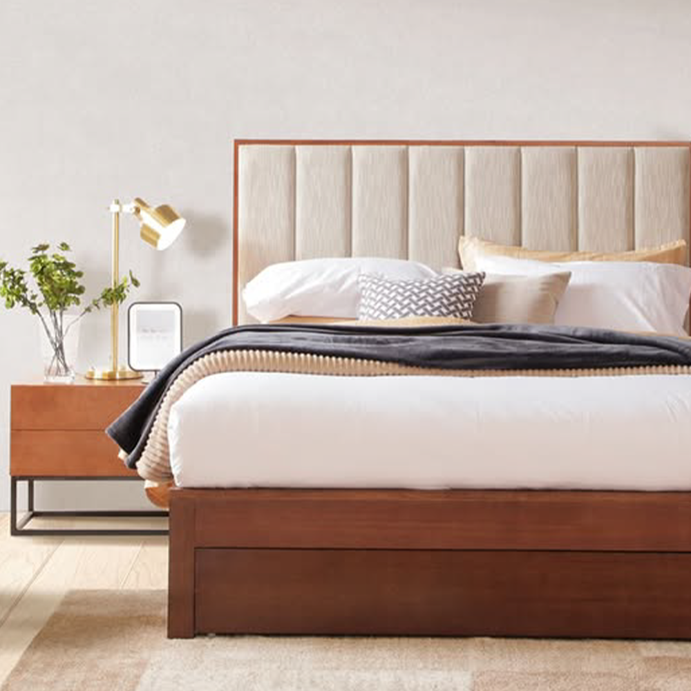 A Modern Contemporary bedframe with padded headboard, 1 built-in drawer and made of wooden frame with kiln dry solid wood slats, cleats and legs in stain finish.